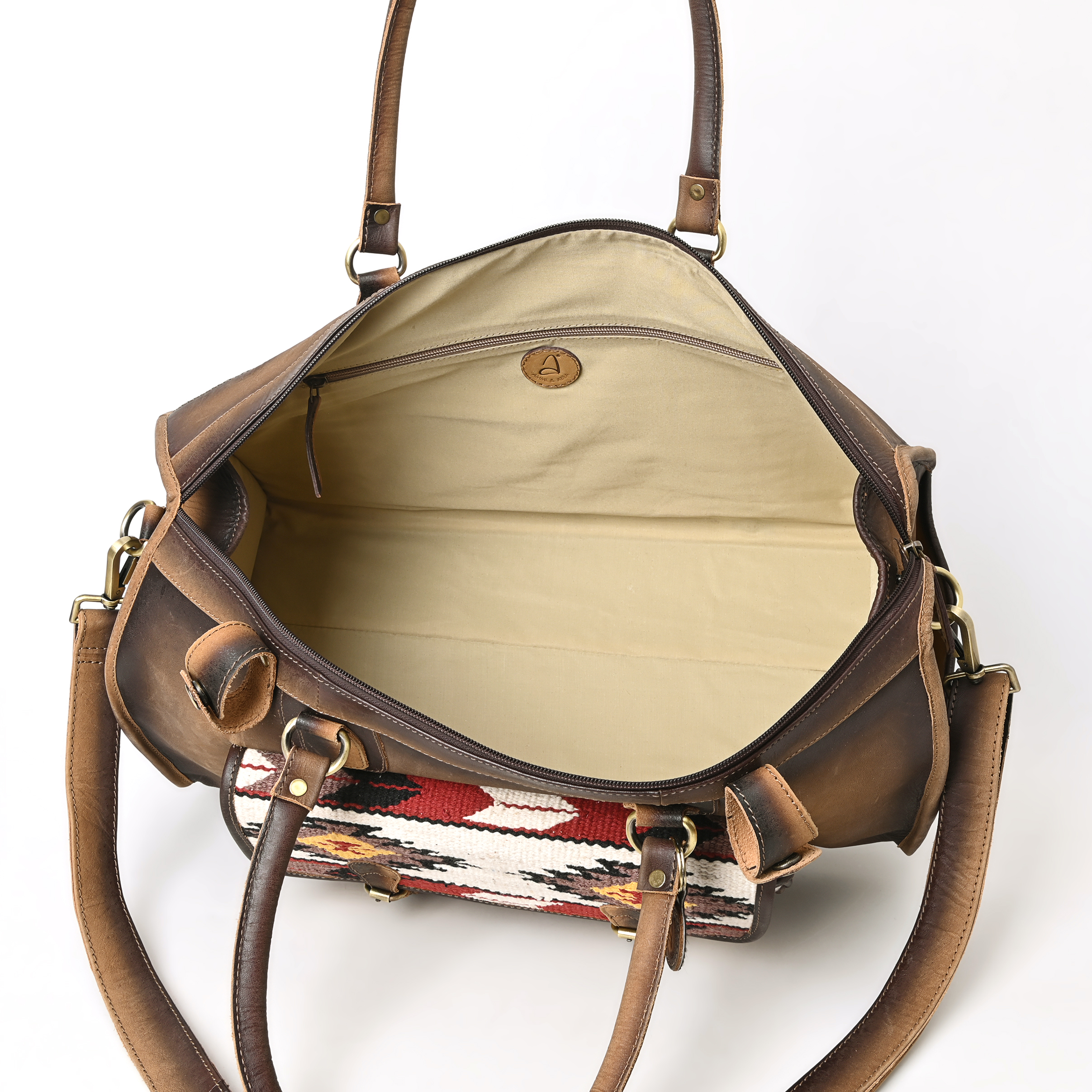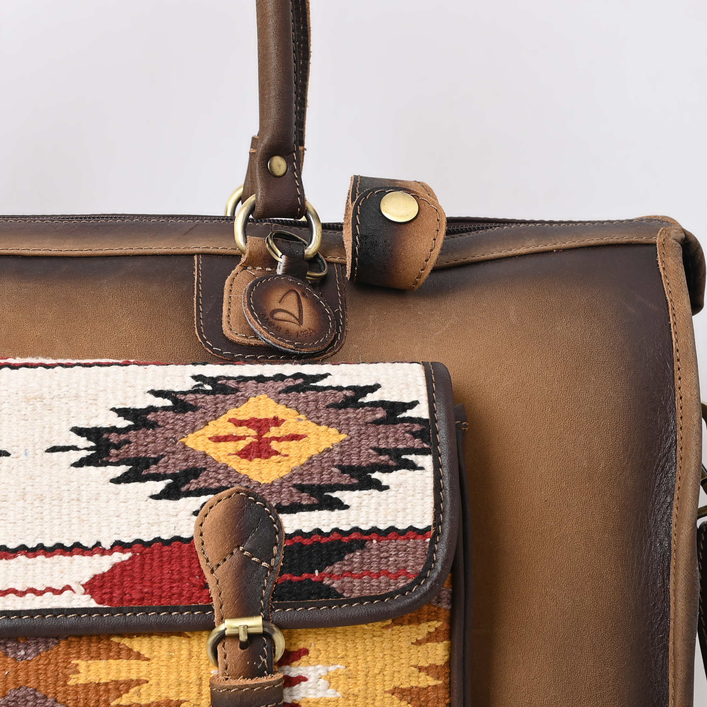 Introducing "The Heritage Traveler," a premium duffel bag crafted for those who appreciate heritage design and fine craftsmanship. Made from full-grain leather, it boasts a rich texture that matures beautifully with use, developing an authentic patina that reflects each journey's story. The standout feature is the front saddle blanket inlay, adding rustic charm to its timeless design.
